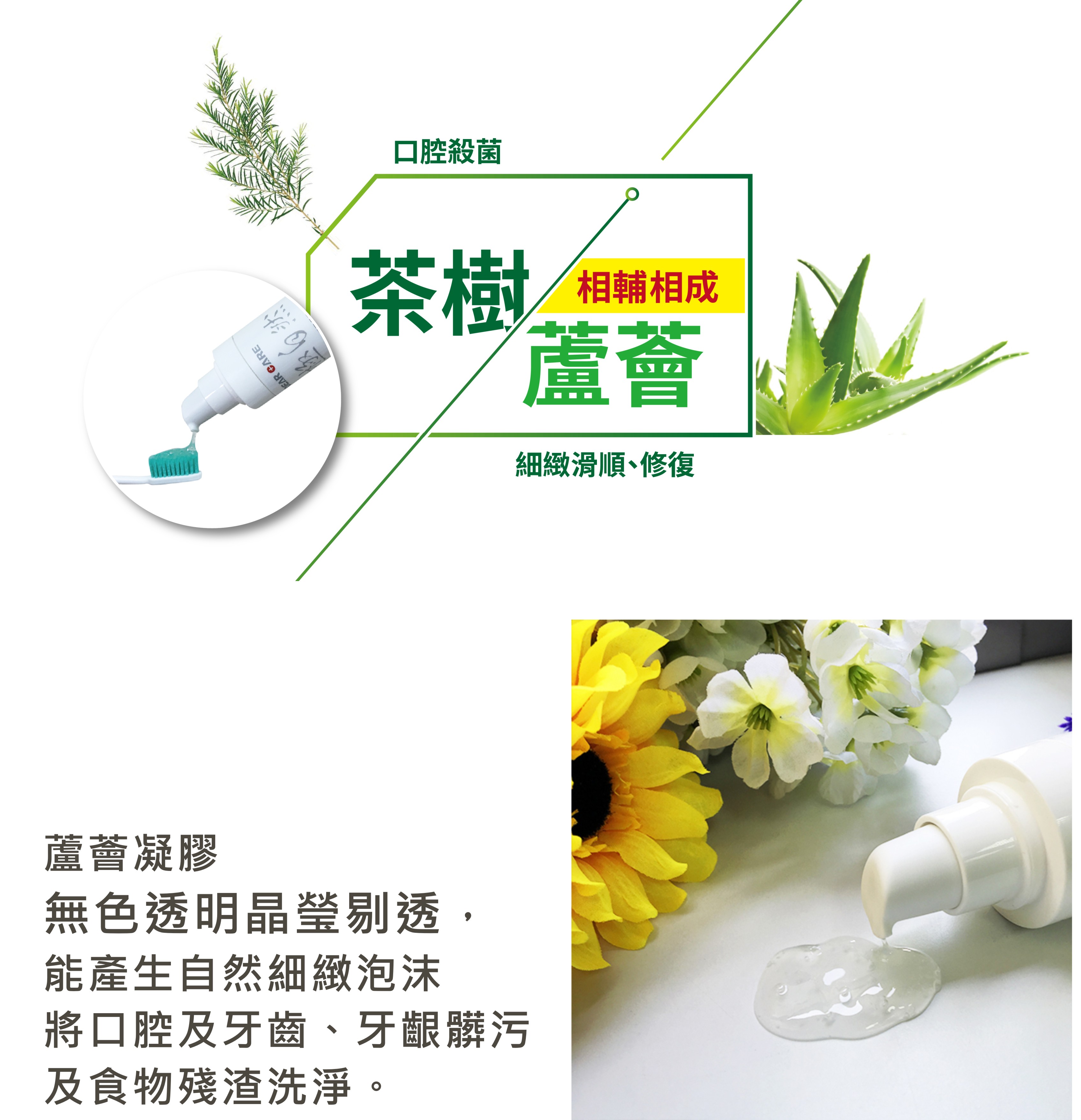 採用自然農耕野化種植草本植物萃取皂素及無色透明蘆薈凝膠晶瑩剔透,能產生自然細緻的泡沫,將口腔及牙齒、牙齦髒污及食物殘渣洗淨。